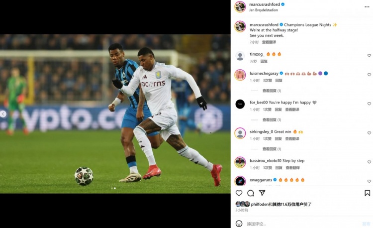 3月5日訊 在本輪歐冠,維拉3-1擊敗布魯日占得先機。本場(chǎng)比賽拉什福德首發(fā)登場(chǎng),賽后他也在個(gè)人社媒曬出本場(chǎng)照片,配文寫(xiě)道:“歐冠之夜!我們距離晉級還有一半路程,下周我們再見(jiàn)!”