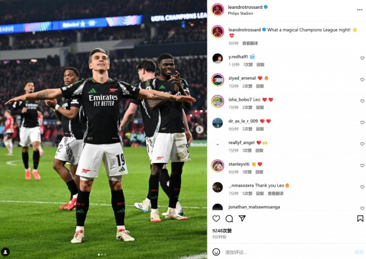 3月5日訊 在本輪歐冠,阿森納7-1大勝埃因霍溫,創(chuàng )造歐冠歷史淘汰賽客場(chǎng)進(jìn)球紀錄。本場(chǎng)比賽特羅薩德首發(fā)出戰并取得進(jìn)球,賽后他也在個(gè)人社媒曬出慶祝進(jìn)球照片,配文寫(xiě)道:“多么神奇的歐冠之夜!”