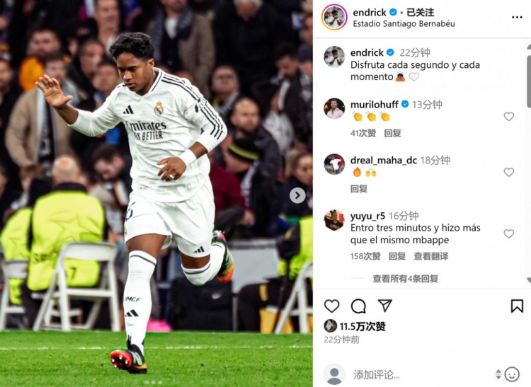 3月5日訊 在本輪歐冠,皇馬2-1擊敗馬競。本場(chǎng)比賽恩德里克在最后時(shí)刻替補登場(chǎng),迎來(lái)個(gè)人歐冠淘汰賽首秀。賽后他也在個(gè)人社媒曬出本場(chǎng)照片,配文寫(xiě)道:“享受比賽的每一個(gè)瞬間!”