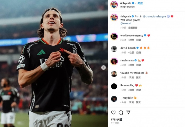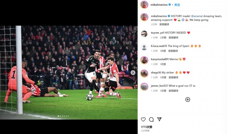 3月5日訊 阿森納在本輪歐冠客場(chǎng)7-1大勝埃因霍溫,梅里諾首發(fā)客串中鋒取得進(jìn)球。第31分鐘,埃因霍溫禁區內一通混戰,雙方人仰馬翻爭奪球權,梅里諾得球直接推射遠角破門(mén)。他也在賽后通過(guò)社媒曬出自己的進(jìn)球瞬