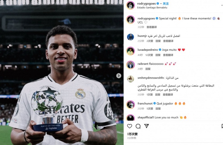3月5日訊 皇馬在本輪歐冠2-1力克馬競,羅德里戈開(kāi)場(chǎng)便為主隊閃擊破門(mén)。第4分鐘,巴爾韋德送出直塞,羅德里戈右路內切,過(guò)掉防守球員之后左腳破門(mén)。羅德里戈在賽后被歐冠官方評為本場(chǎng)最佳球員,他也通過(guò)社媒曬