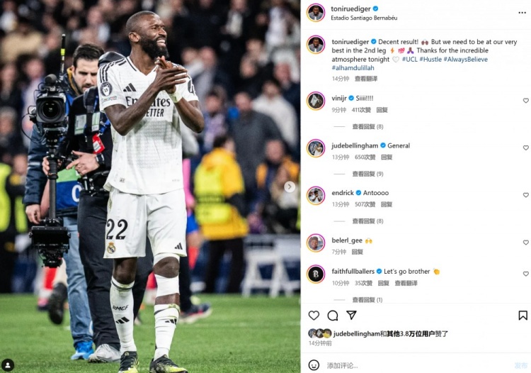 3月5日訊 在本輪歐冠,皇馬2-1擊敗馬競。賽后呂迪格也在個(gè)人社媒曬出本場(chǎng)照片,配文寫(xiě)道:“不錯的結果,但是下一回合我們要拿出自己最佳的狀態(tài),感謝球迷們今夜難以置信的支持!”