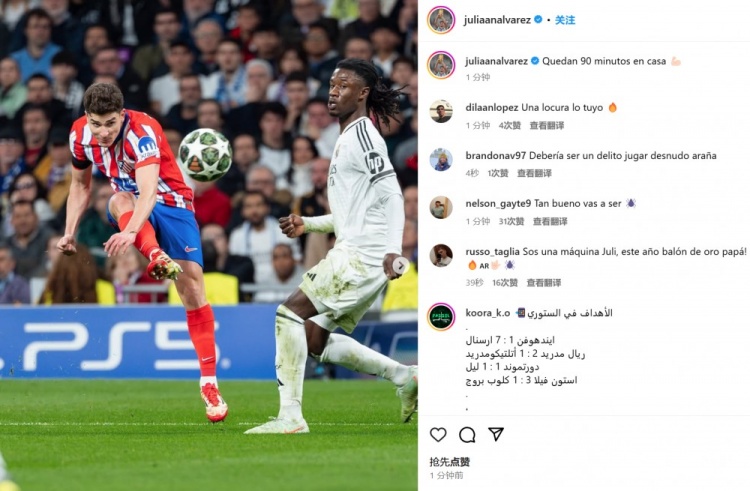 內切兜射世界波!阿爾瓦雷斯社媒曬進(jìn)球瞬間:回到主場(chǎng)還有90分鐘
