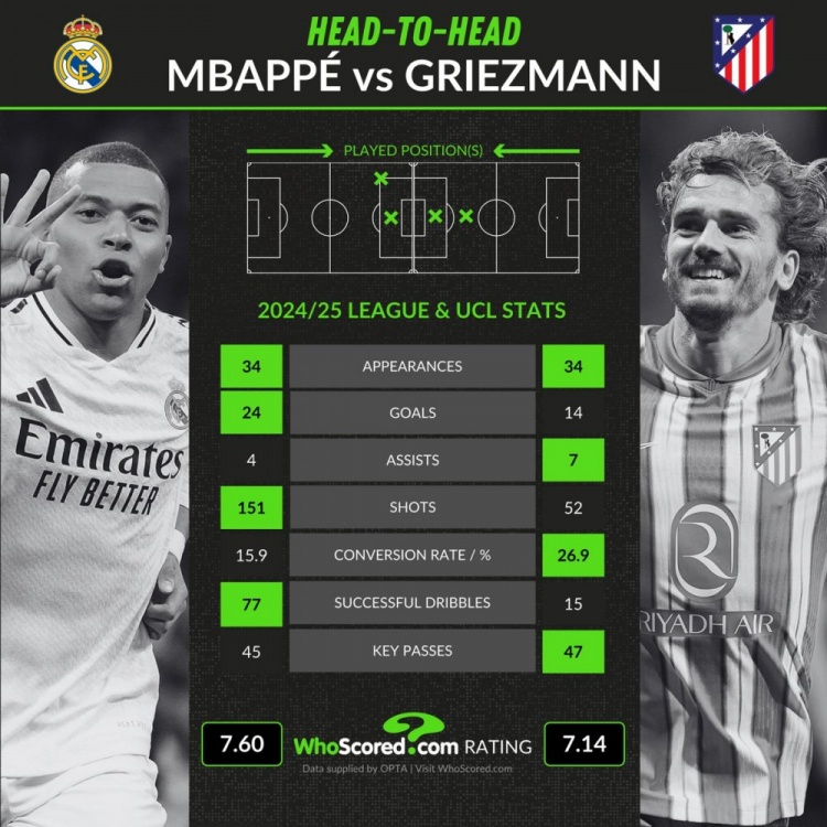 3月5日訊 歐冠十六強戰將上演馬德里同城德比,whoscored也對比了姆巴佩和格列茲曼本賽季的關(guān)鍵數據。本賽季聯(lián)賽+歐冠關(guān)鍵數據對比:姆巴佩(皇馬,26歲):34場(chǎng),24球,4助攻,151射門(mén),轉化