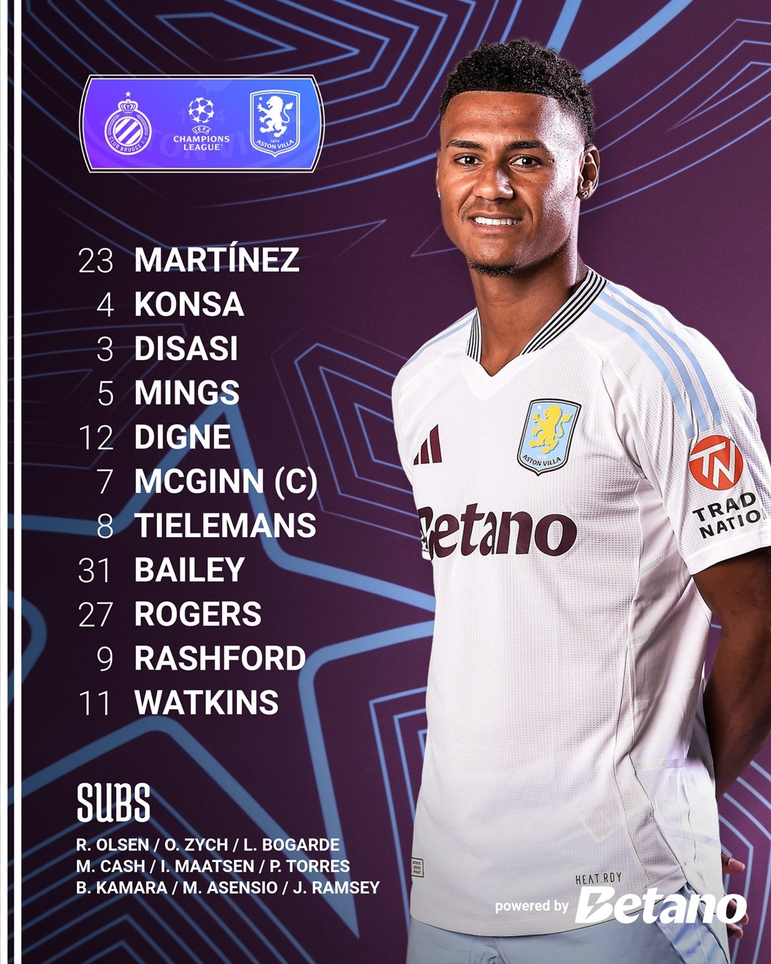 拉師傅出戰歐冠淘汰賽!維拉vs布魯日:拉什福德、沃特金斯先發(fā)