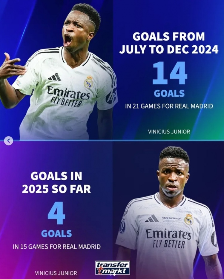 3月5日訊 皇馬即將迎來(lái)同馬競的歐冠同城德比,維尼修斯狀態(tài)能否回暖值得期待。數據統計顯示,維尼修斯在本賽季上半程(7月至12月)21場(chǎng)打進(jìn)14球,而進(jìn)入2025年后15場(chǎng)僅4球入賬。作為對比,姆巴佩在
