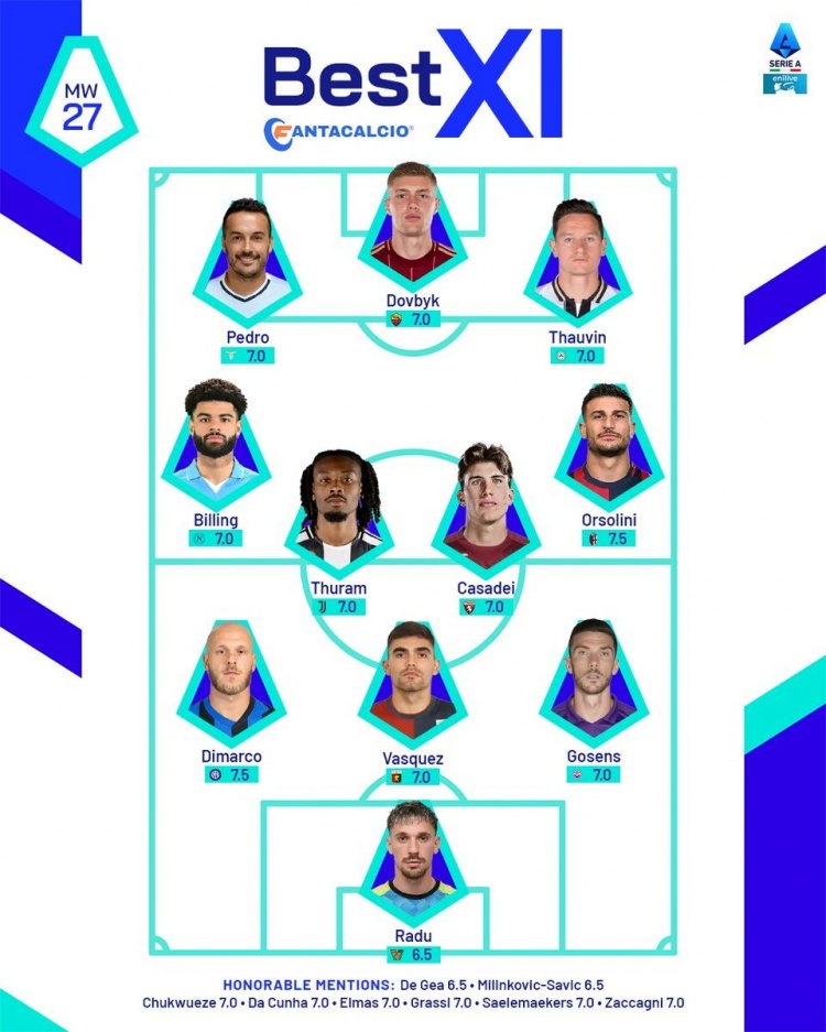 意甲本輪官方最佳陣:K-圖拉姆、迪馬爾科領(lǐng)銜,佩德羅在列