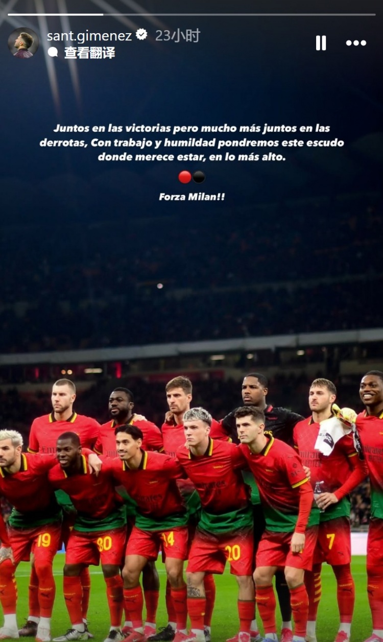 3月5日訊 意甲第27輪,米蘭1-2不敵拉齊奧,慘遭聯(lián)賽三連敗。賽后,S-希門(mén)尼斯更新社媒,為球隊鼓舞士氣。S-希門(mén)尼斯曬出賽前全隊合影,并寫(xiě)道:勝利時(shí)我們團結一致,失敗時(shí)更會(huì )同舟共濟。通過(guò)努力和謙遜