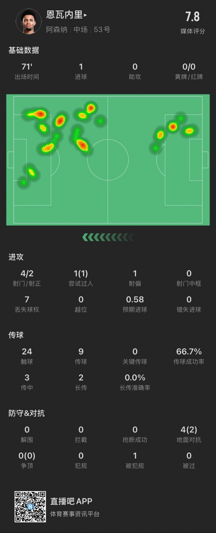 17歲恩瓦內里本場(chǎng):4射2正進(jìn)1球,1次過(guò)人成功,4次對抗成功2次