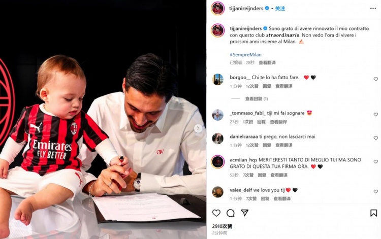賴(lài)因德斯社媒曬簽字續約照:很感激能在未來(lái)幾年繼續效力米蘭