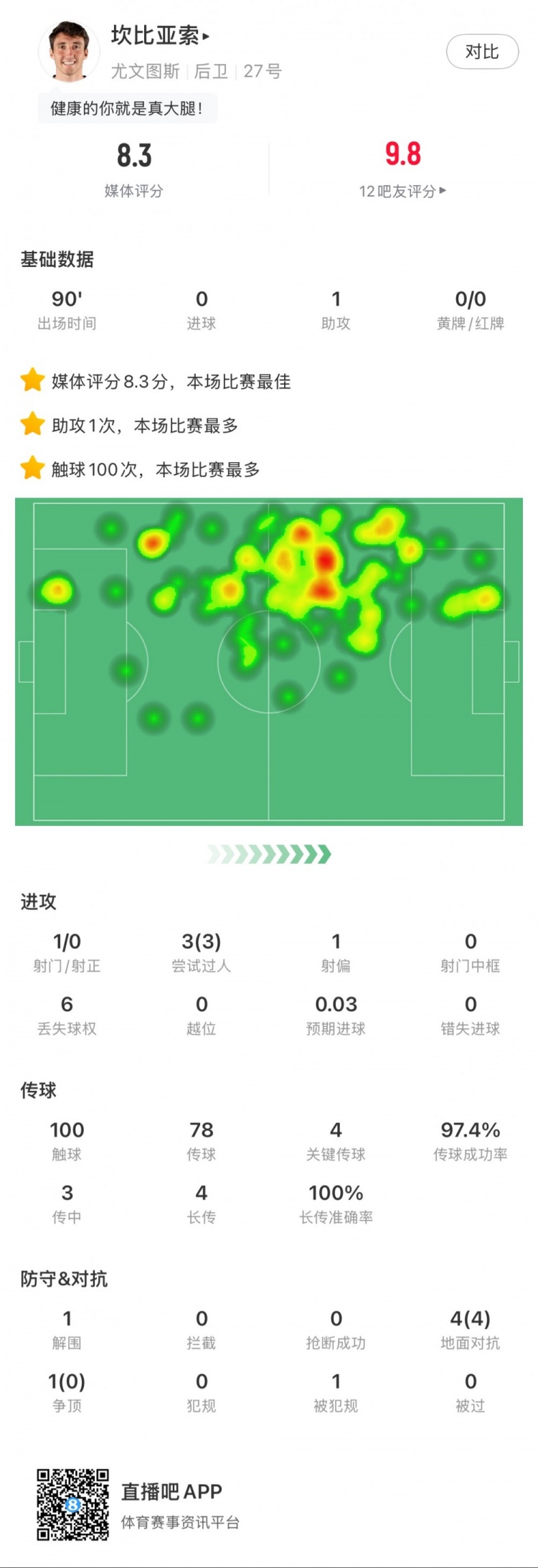 坎比亞索本場(chǎng)數據:1次助攻,4次關(guān)鍵傳球,3次成功過(guò)人