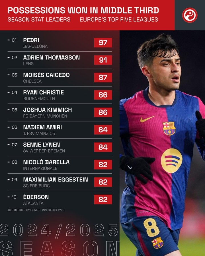 又嫩又狠!佩德里97次在中場(chǎng)搶回球權,冠絕五大聯(lián)賽