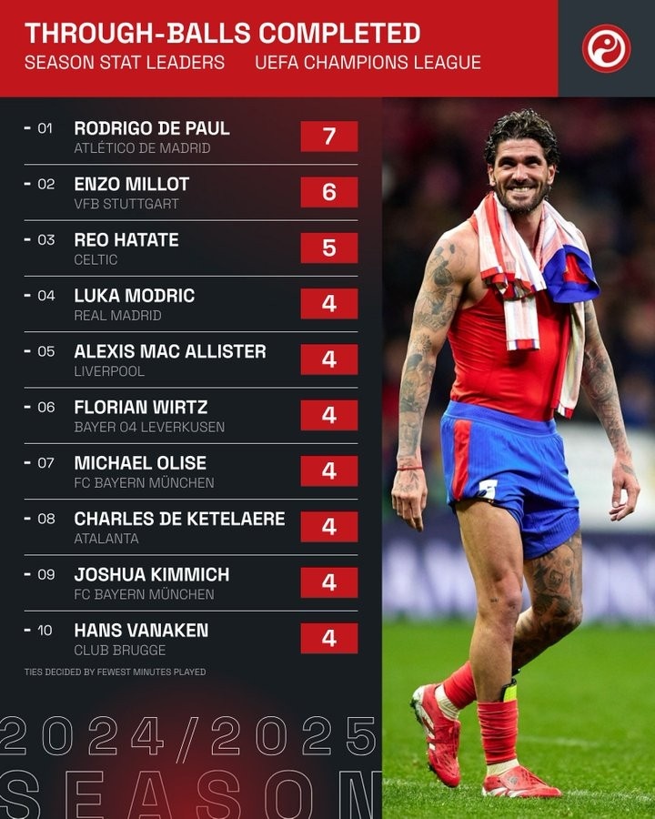 3月4日訊 歐冠十六強戰即將戰火重燃,數據機構squawka統計了本賽季歐冠精準直塞情況,德保羅居首。本賽季歐冠精準直塞榜:1.德保羅(馬競),7次2.恩佐-米洛(斯圖加特),6次3.旗手憐央(凱爾特