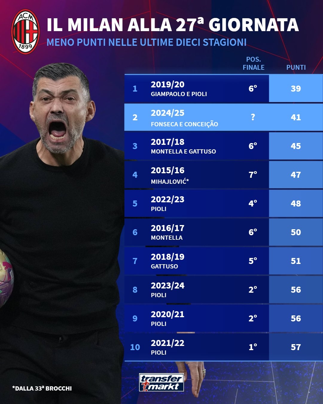 還能再差嗎?米蘭27輪41分是過(guò)去十年同期第二低 僅好于19/20賽季