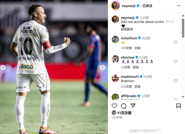 加盟桑托斯7場(chǎng)3球3助,內馬爾社媒曬照:別把我從夢(mèng)中叫醒