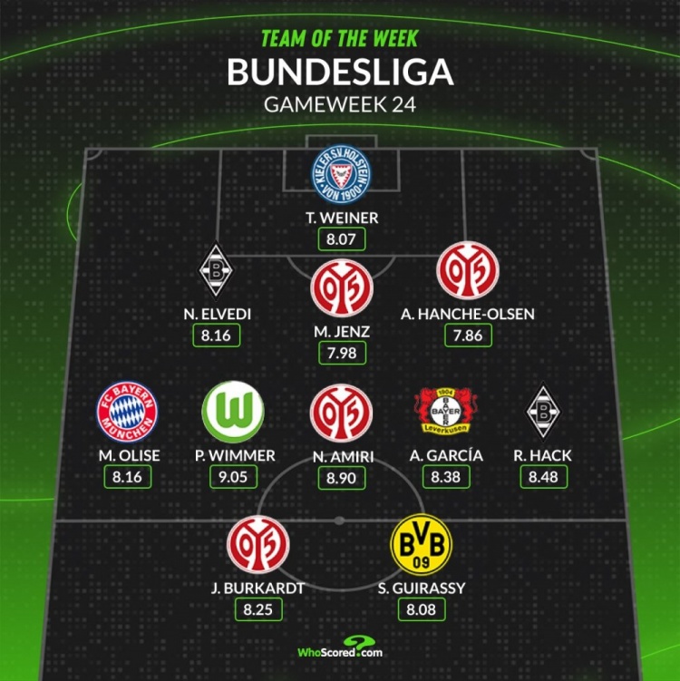 whoscored德甲本輪最佳陣:奧利塞、吉拉西領(lǐng)銜,美因茨4將在列