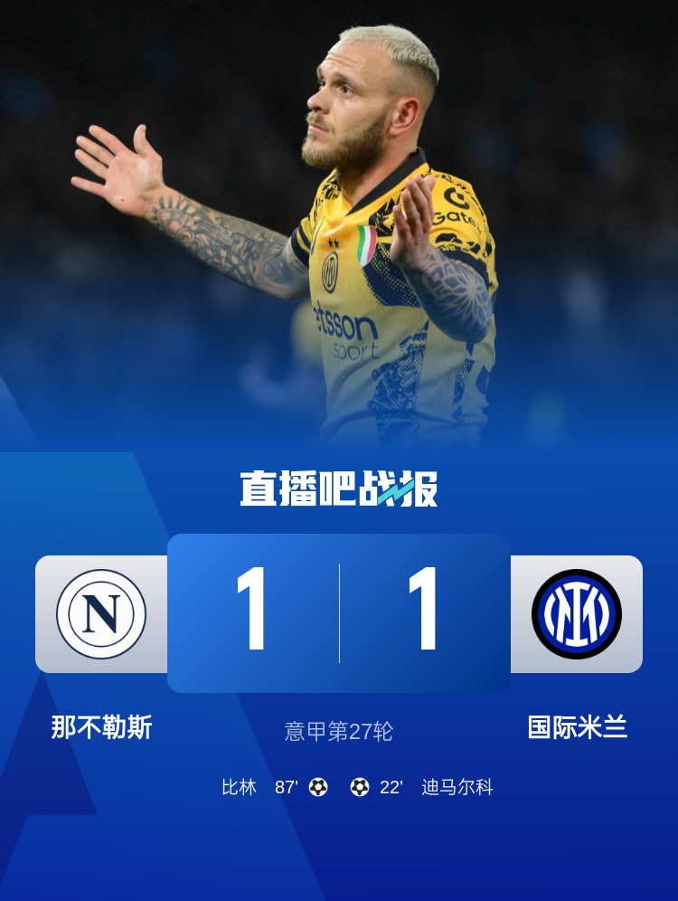 意甲積分榜:天王山之戰1-1收場(chǎng),國米仍居榜首,那不勒斯第二