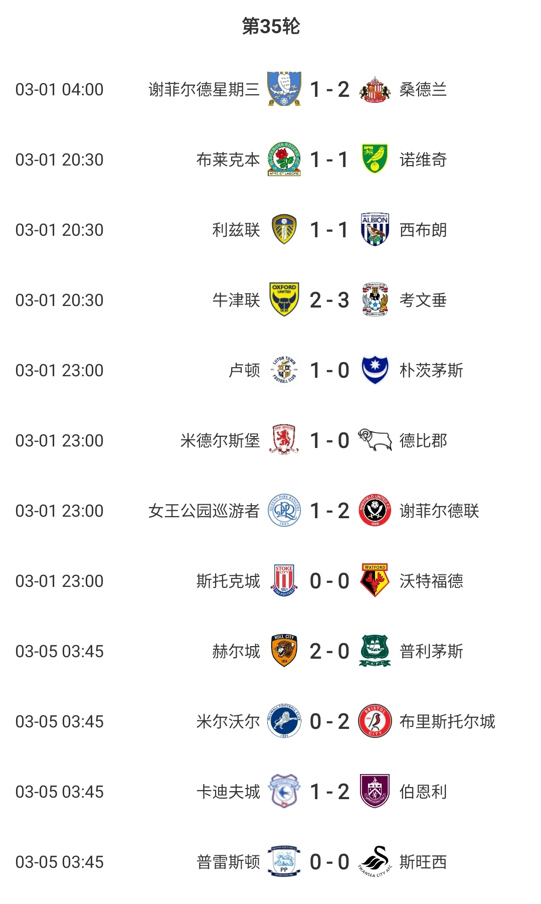 03月05日訊 英冠第35輪在北京時(shí)間今天凌晨全部結束,目前利茲聯(lián)3分領(lǐng)跑,因財務(wù)違規開(kāi)局被扣2分的謝菲爾德聯(lián)第2,伯恩利35輪僅丟10球排名第3,桑德蘭積65分位列第4,這四支球隊斷層領(lǐng)跑。