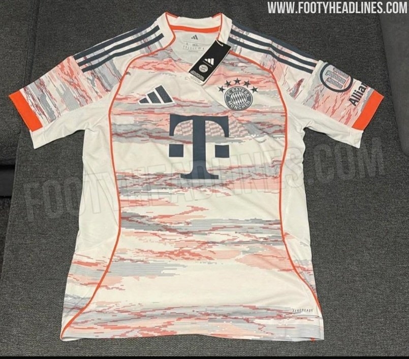 拜仁25-26賽季客場(chǎng)球衣曝光,白色搭配紅色灰色抽象圖案