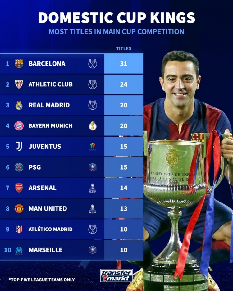 德轉列五大聯(lián)賽國內杯賽奪冠榜:巴薩31次第1,畢巴24次第2