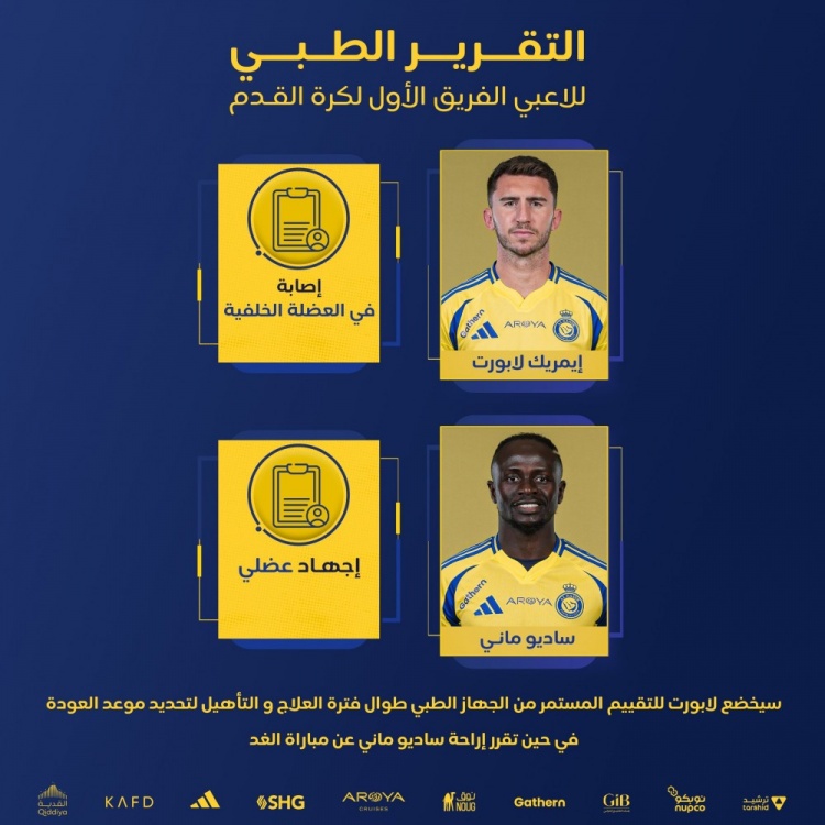2月28日訊 今日,利雅得勝利官方公布了馬內和拉波爾特的傷病情況,根據此前報道,他倆都將缺陣本周末與歐魯巴赫的沙特聯(lián)比賽。根據公告顯示,拉波爾特遭遇肌肉損傷,將進(jìn)行進(jìn)一步評估,復出時(shí)間視治療和康復情況