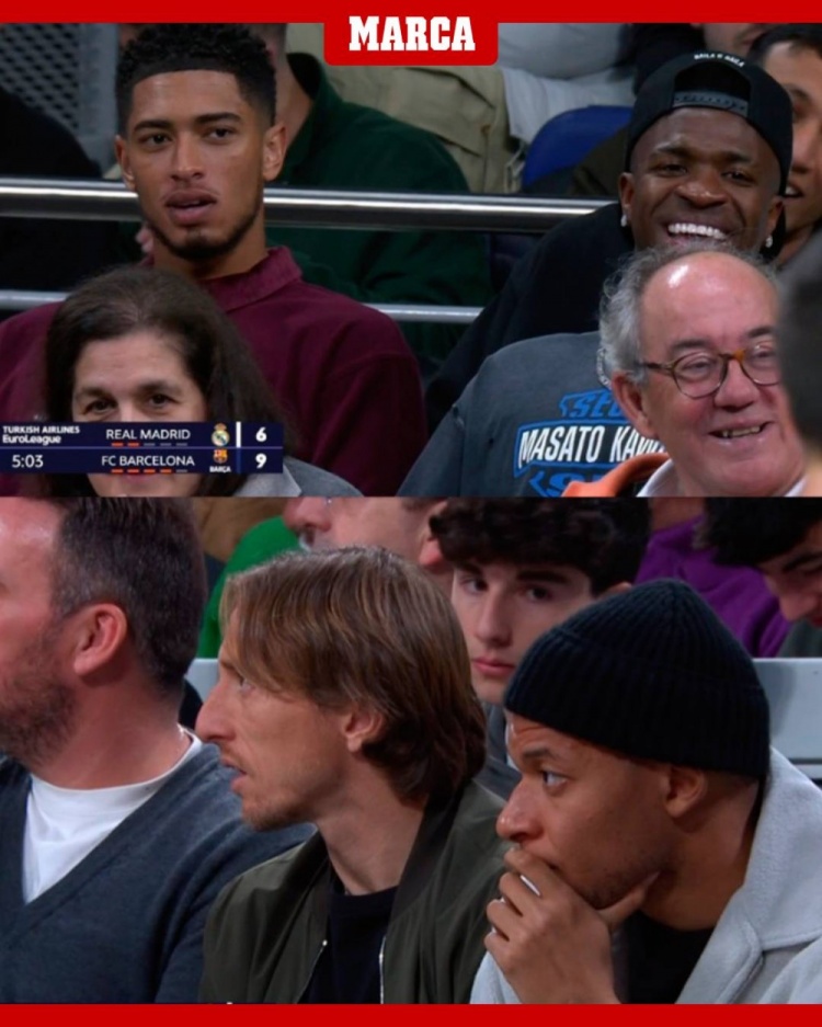 國王杯取勝后,姆巴佩&貝林&維尼修斯等現場(chǎng)觀(guān)看歐冠男籃國家德比