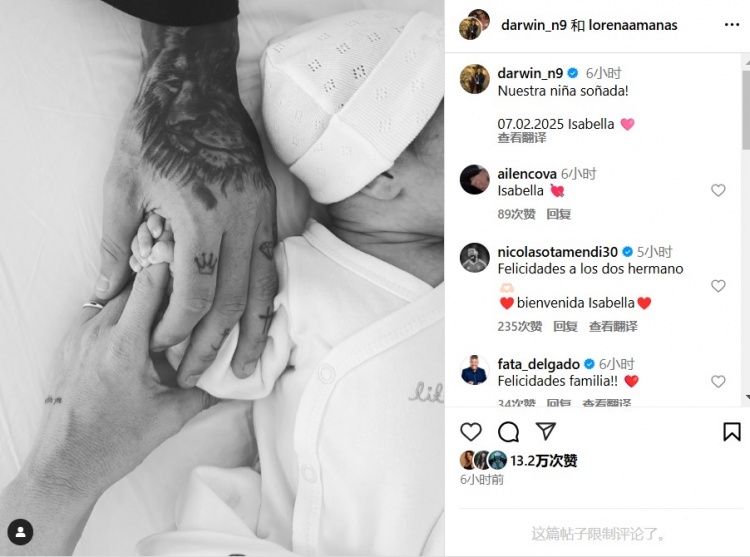 2月28日訊 努涅斯更新了社媒動(dòng)態(tài)曬出圖片,向外界透露他和女友的第二個(gè)孩子在2月初出生。努涅斯表示道:“我們的夢(mèng)中女孩,2025年2月7日,伊莎貝拉????”。伊莎貝拉是努涅斯和女友洛蕾娜之間的第二個(gè)孩子