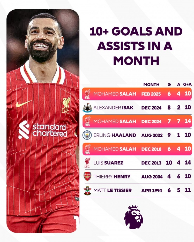 2月28日訊 英超官方盤(pán)點(diǎn),薩拉赫是英超歷史上僅有的多次單月聯(lián)賽制造10+球的球員,而薩拉赫至今已經(jīng)有3次。薩拉赫:2025年2月、6球4助制造10球伊薩克:2024年12月、8球2助制造10球薩拉赫