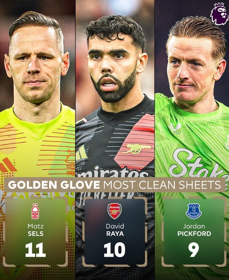 金手套獎爭奪!英超本賽季零封場(chǎng)次榜:塞爾斯11場(chǎng)居首,拉亞次席
