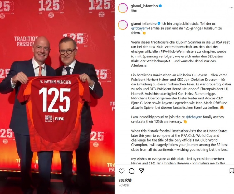 2月27日訊 拜仁慕尼黑俱樂(lè )部在此前進(jìn)行了俱樂(lè )部125周年慶典活動(dòng),國際足聯(lián)主席因凡蒂諾受邀出席。目前他更新了社媒。因凡蒂諾:“我非常自豪能能參加拜仁的125周年慶典,當這一歷史悠久的俱樂(lè )部將在今年晚
