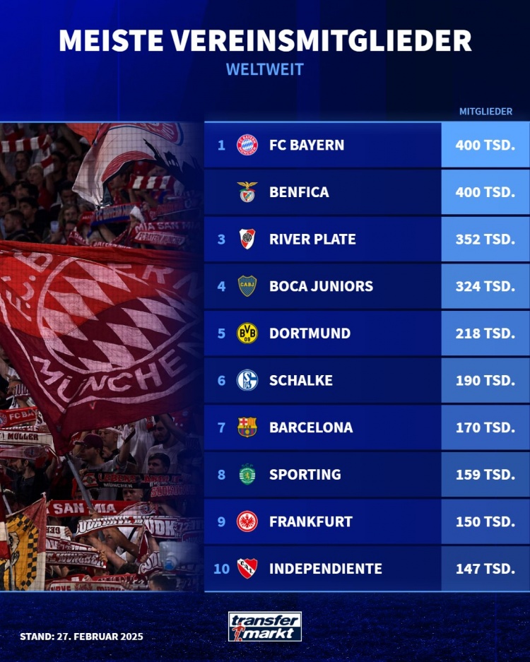 俱樂(lè )部會(huì )員人數排行:拜仁、本菲卡40萬(wàn)居首,多特第5,巴薩第7