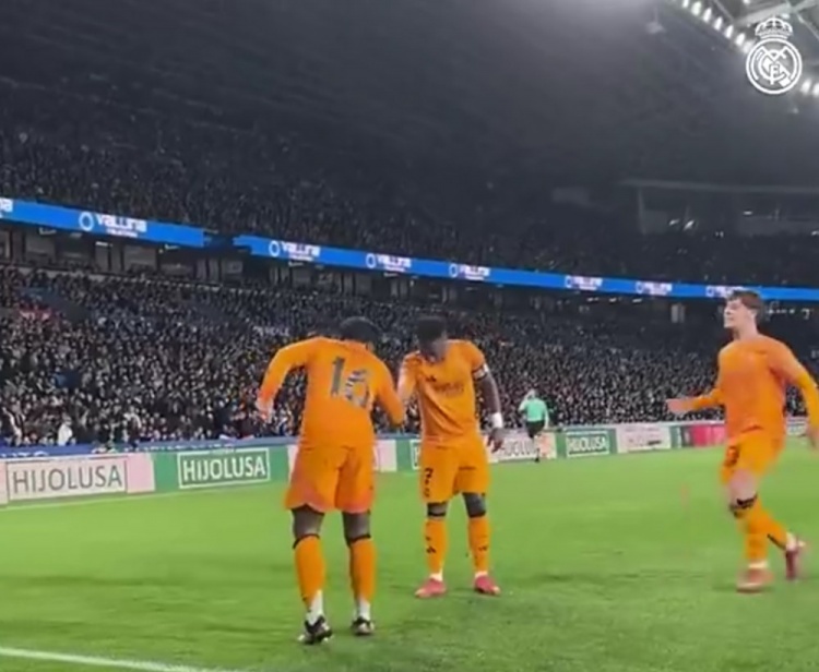 國王杯戰勝皇家社會(huì ),恩德里克進(jìn)球后與維尼修斯握手慶祝