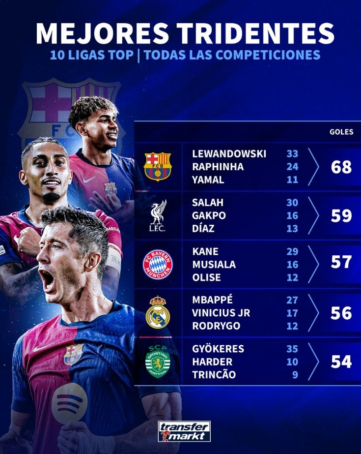 2月27日訊 德轉盤(pán)點(diǎn)了本賽季歐洲前十聯(lián)賽各項賽事進(jìn)球最多鋒線(xiàn)三叉戟,其中巴薩三將以68球領(lǐng)跑,具體如下:巴薩:68球萊萬(wàn)33球,拉菲尼亞24球,亞馬爾11球利物浦:59球薩拉赫30球,加克波16球,