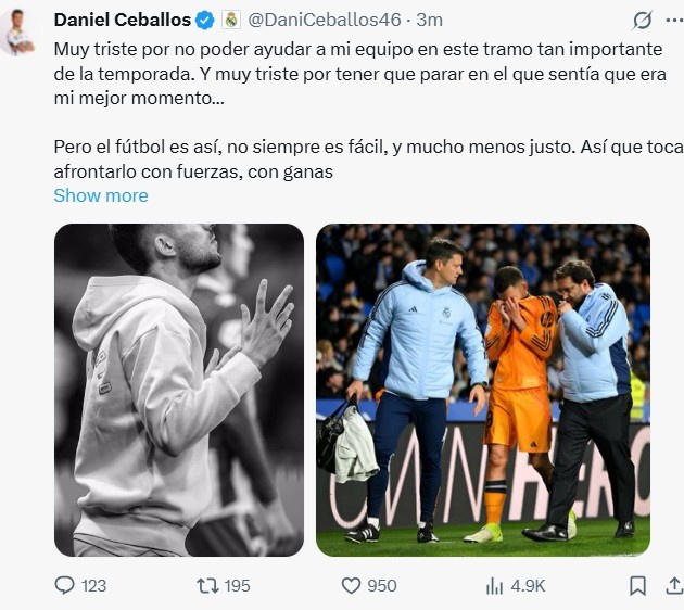 2月27日訊 皇馬官方宣布塞巴略斯左腿半膜肌受傷&肌腱受損,多家媒體表示他預計傷停2個(gè)月時(shí)間。塞巴略斯更新了社媒。塞巴略斯表示道:“在本賽季非常重要的階段,我很遺憾不能幫助我的球隊,我很難過(guò)不得不在我