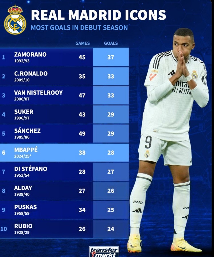 皇馬隊史首秀賽季進(jìn)球榜:薩莫拉諾37球居首,姆巴佩28球第6