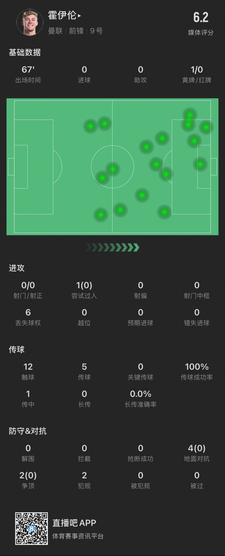 霍伊倫本場(chǎng):射門(mén)關(guān)鍵傳球等數據掛零,6次對抗0成功,僅觸球12次