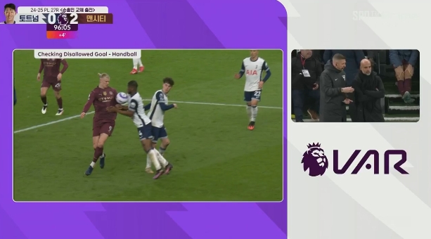 2月27日訊 英超第27輪,熱刺vs曼城。比賽補時(shí)階段,哈蘭德破門(mén)!隨后VAR介入,哈蘭德、丹索均有手球嫌疑,最終進(jìn)球被判無(wú)效!