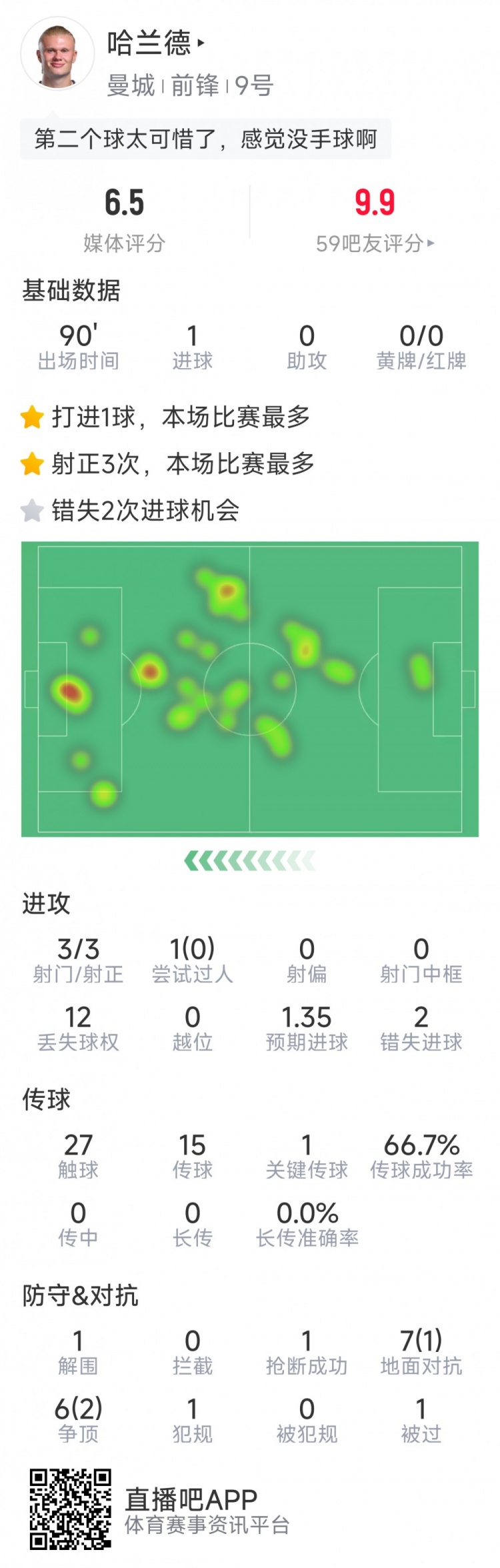 哈蘭德本場(chǎng)數據:1粒進(jìn)球,3次射門(mén)均射正,2次錯失良機