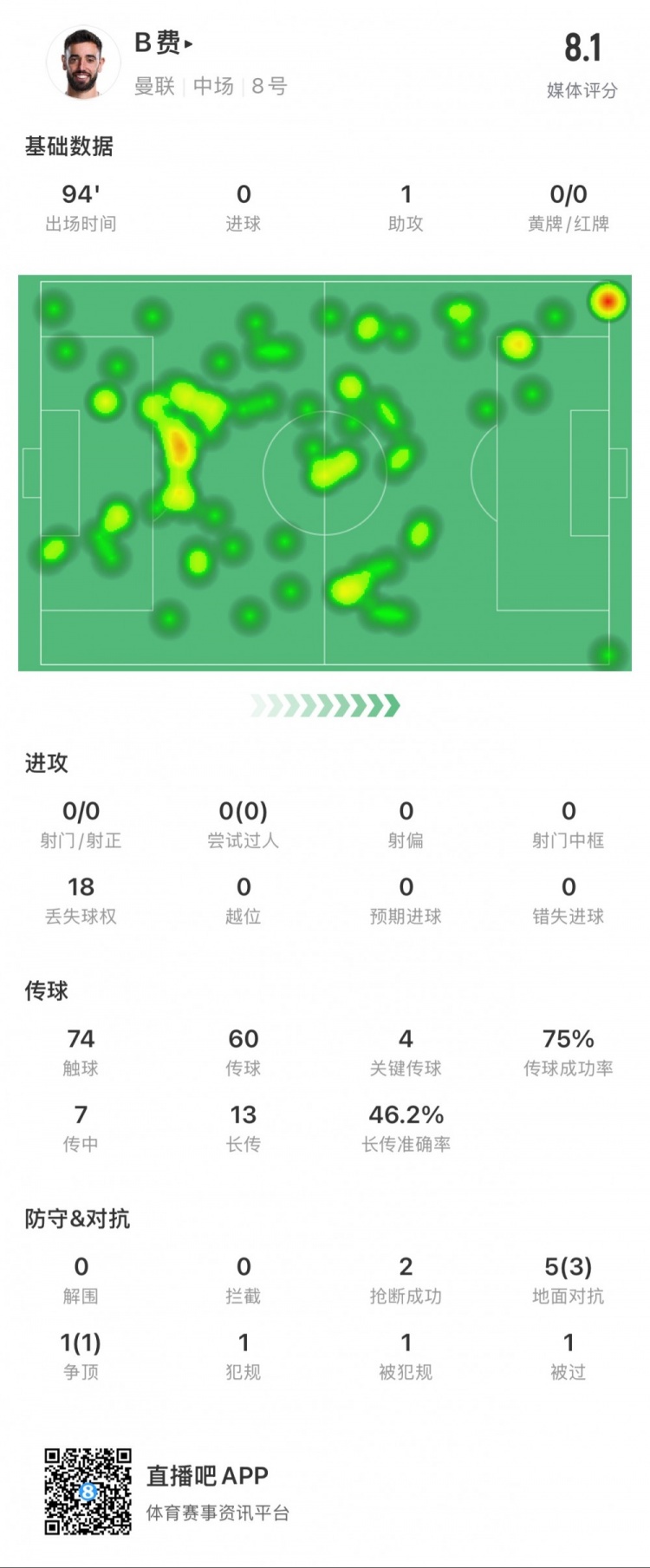 B費本場(chǎng)數據:1次助攻,4次關(guān)鍵傳球,14次長(cháng)傳成功7次