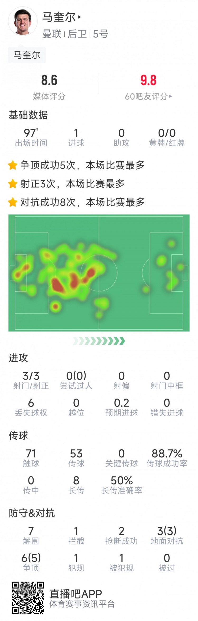 戰神!馬奎爾本場(chǎng)數據:1粒進(jìn)球,3次射正,7次解圍,2搶斷