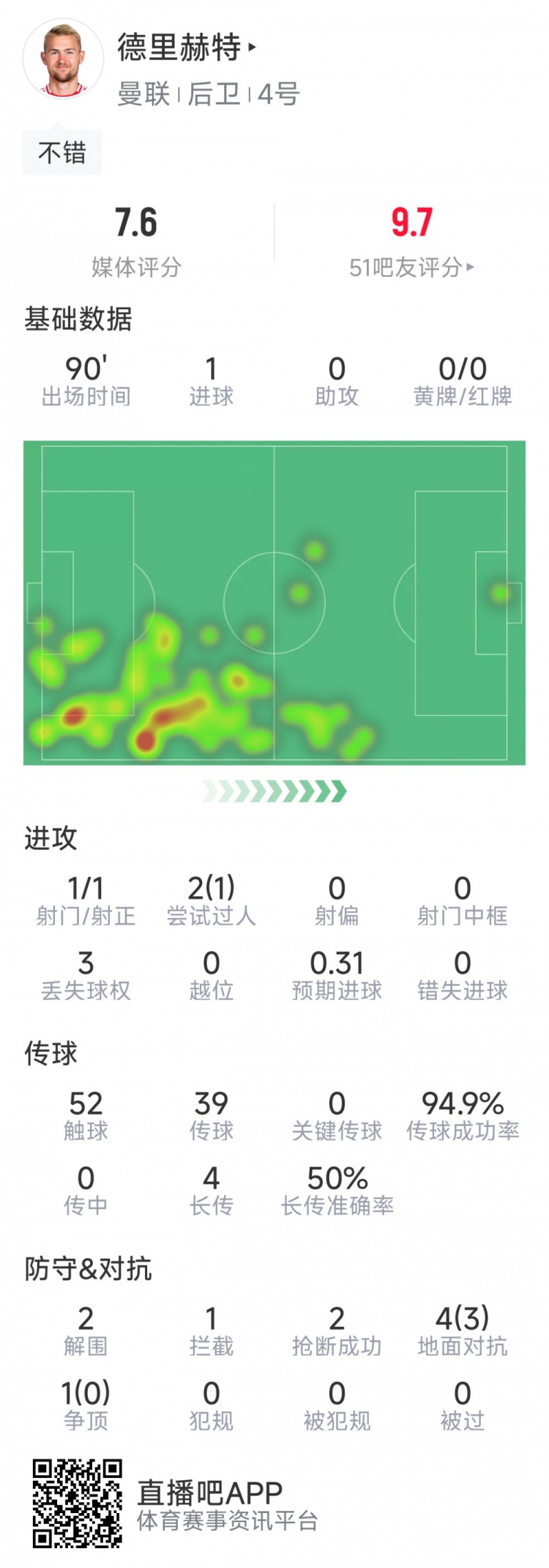 德里赫特本場(chǎng)數據:1粒進(jìn)球,2解圍,2搶斷,3次成功對抗
