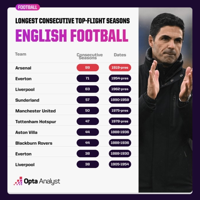 英格蘭第一!阿森納將連續100個(gè)賽季征戰英格蘭頂級聯(lián)賽
