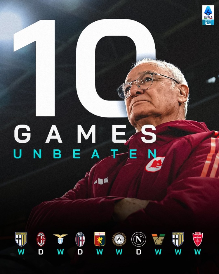 2月26日訊 北京時(shí)間昨日意甲第26輪羅馬主場(chǎng)4-0大勝蒙扎,拉涅利帶領(lǐng)羅馬在過(guò)去10輪聯(lián)賽中保持不敗,取得7勝3平的戰績(jì),意甲官方曬出關(guān)于這名老帥帶隊出色戰績(jì)的海報。73歲的拉涅利在去年11月14日