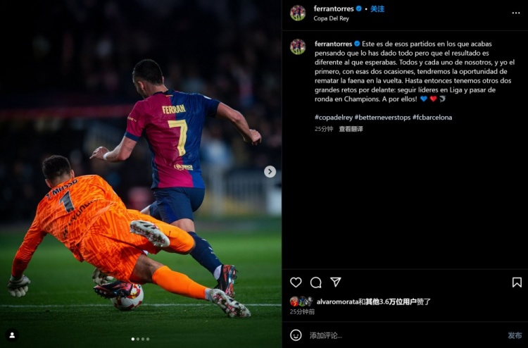 2月26日訊 國王杯半決賽首回合,巴薩4-4遭馬競絕平,費蘭錯失兩次絕佳進(jìn)球機會(huì )。賽后,費蘭更新社媒,鼓舞士氣。費蘭寫(xiě)道:這是一場(chǎng)你認為自己已經(jīng)全力以赴但結果卻未達預期的比賽。我們所有人都有機會(huì )在次回