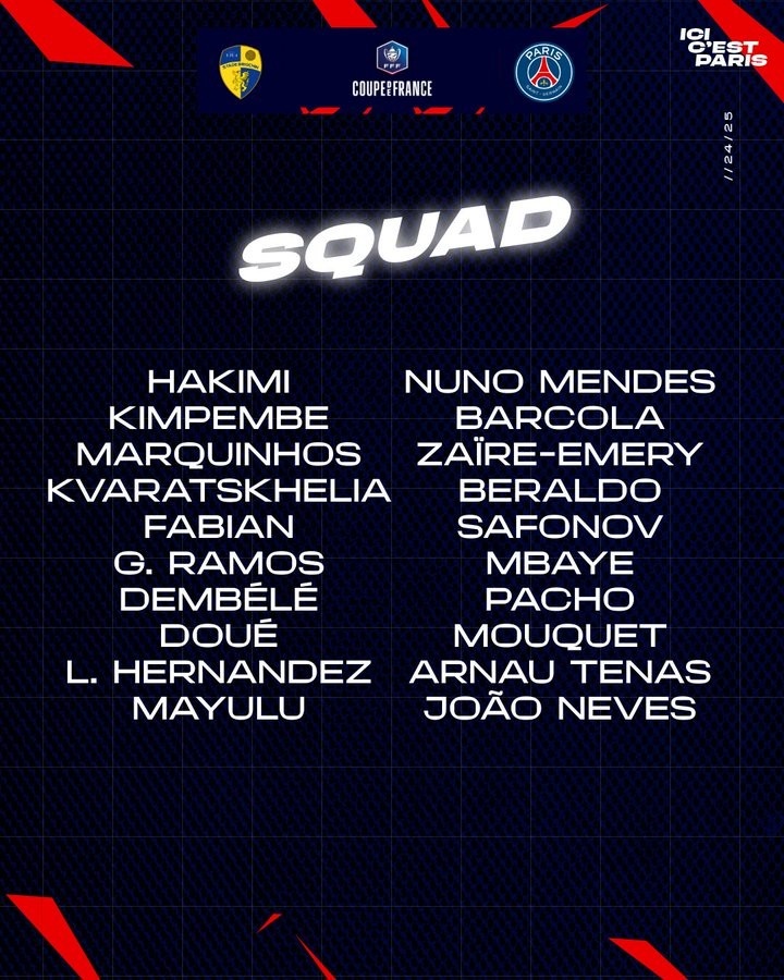 巴黎法國杯大名單:李剛仁&維蒂尼亞&多納魯馬缺席 小埃梅里回歸