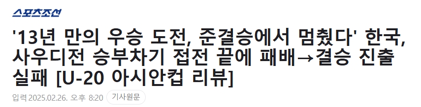 “13年來(lái)的冠軍爭奪止步半決賽”韓國點(diǎn)球大戰惜敗沙特→無(wú)緣決賽韓國U-20未能重奪亞洲霸主地位……點(diǎn)球大戰負于沙特阿拉伯“真遺憾”韓國U20在半決賽中經(jīng)過(guò)激烈的點(diǎn)球大戰輸給了“強隊”沙特阿拉伯……時(shí)隔