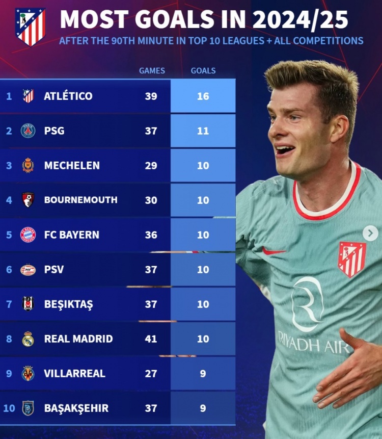 本賽季90分鐘后進(jìn)球榜:馬競16球居首,巴黎、拜仁、皇馬在列