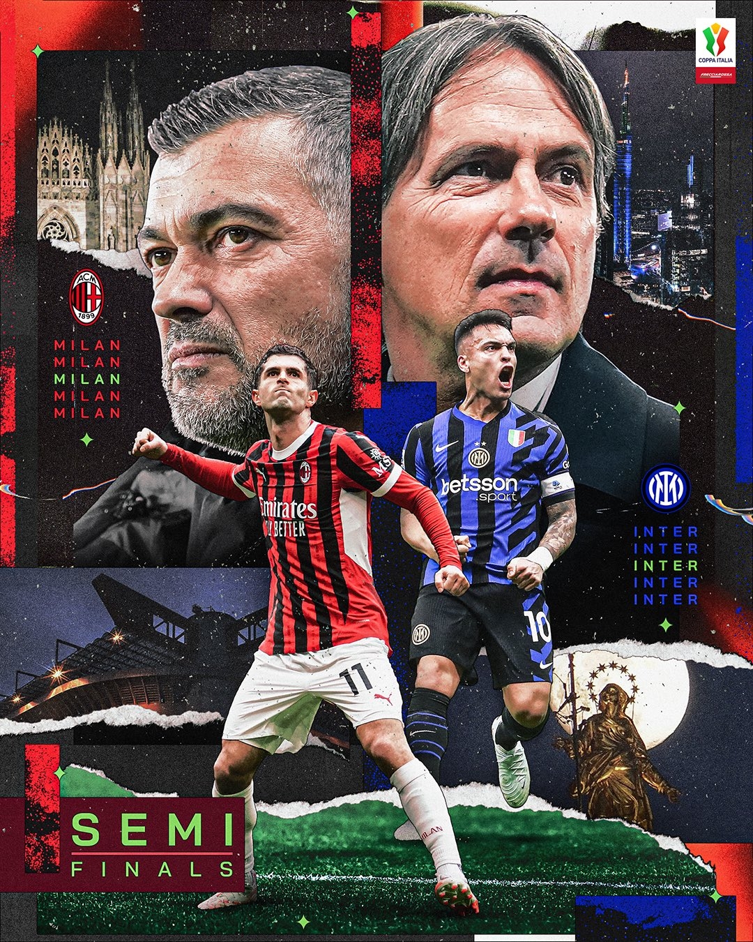 2月26日訊 在本輪意大利杯國米2-0擊敗拉齊奧晉級4強。國米半決賽的對手將是AC米蘭,官方也曬出海報為這場(chǎng)米蘭德比預熱,海報中兩隊主帥小因扎吉、孔塞桑,以及普利西奇、勞塔羅出鏡。