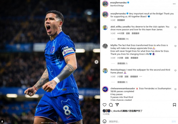 2月26日訊 在本輪英超,切爾西4-0大勝南安普頓。本場(chǎng)比賽恩佐首發(fā)出戰表現出色,貢獻7次關(guān)鍵傳球,賽后恩佐也在個(gè)人社媒曬出怒吼慶祝照,配文寫(xiě)道:“在主場(chǎng)取得一場(chǎng)重要的勝利,感謝大家的支持,藍軍全員團