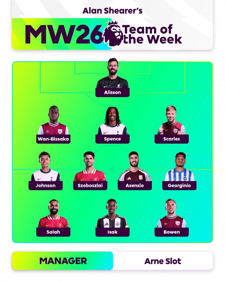希勒評本輪英超最佳陣:薩拉赫領(lǐng)銜,伊薩克、索博、萬(wàn)比薩卡入選